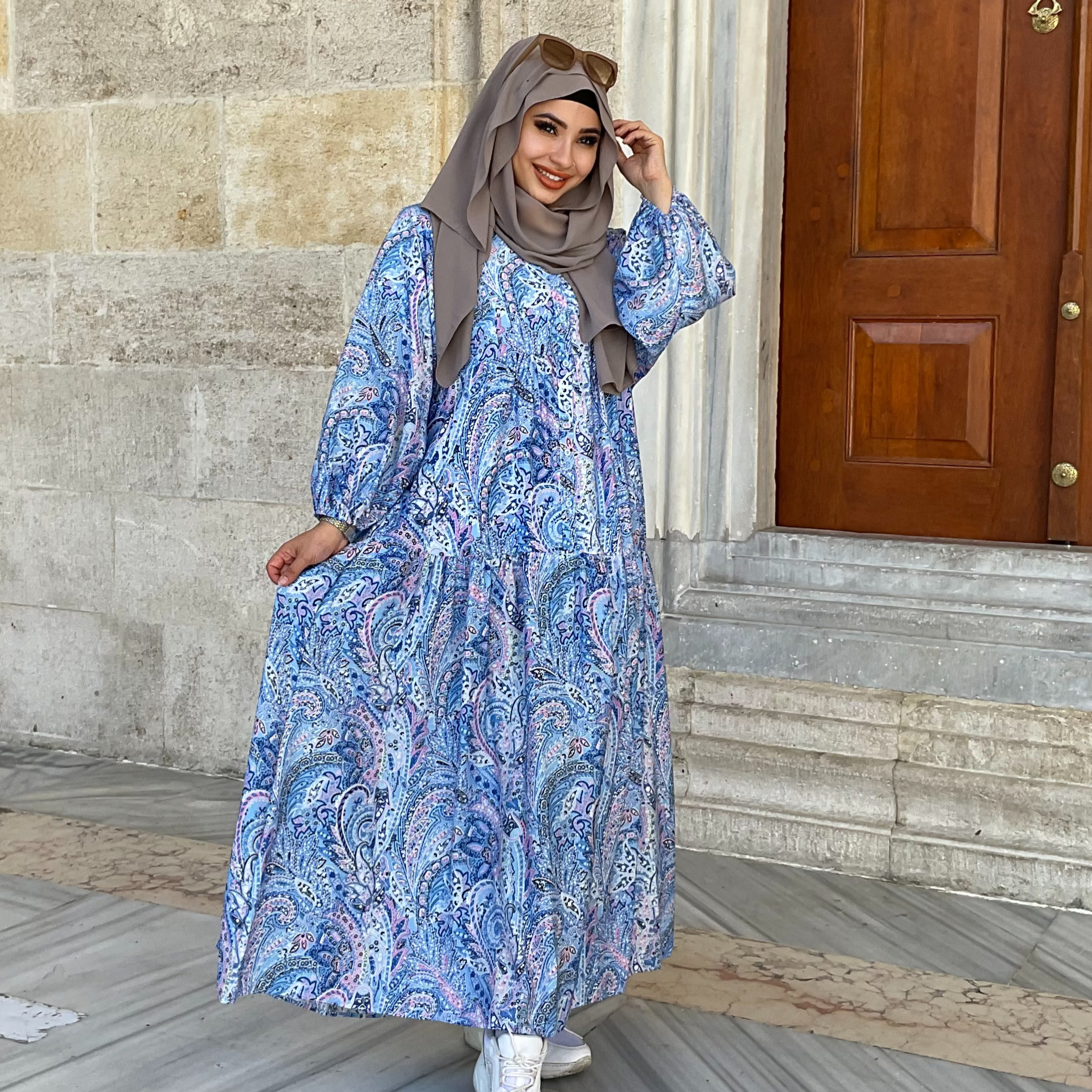 pamuklu şal desenli mavi elbise
