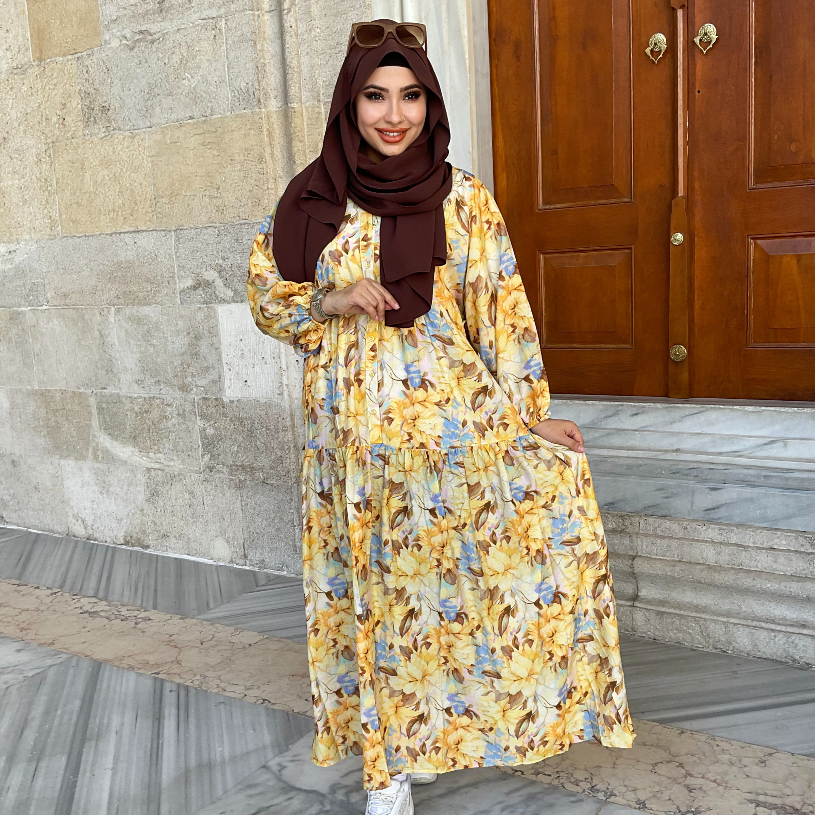 pamuklu sarı çiçekli kahve detaylı elbise